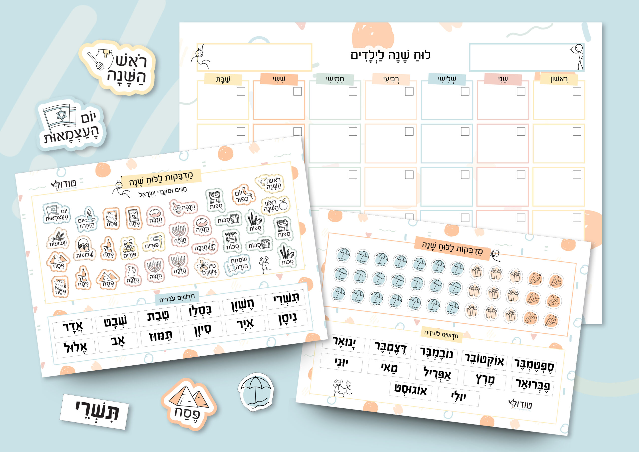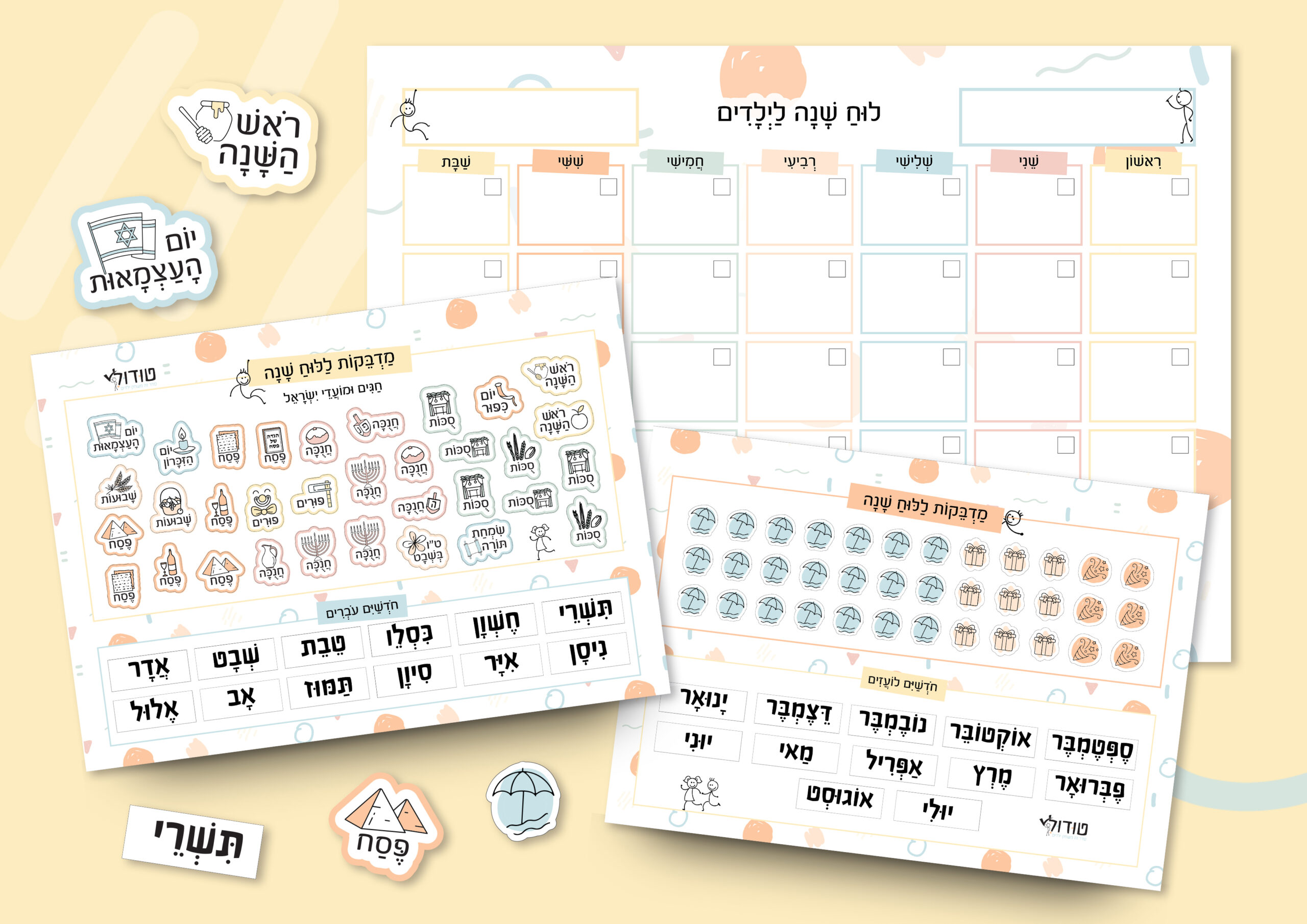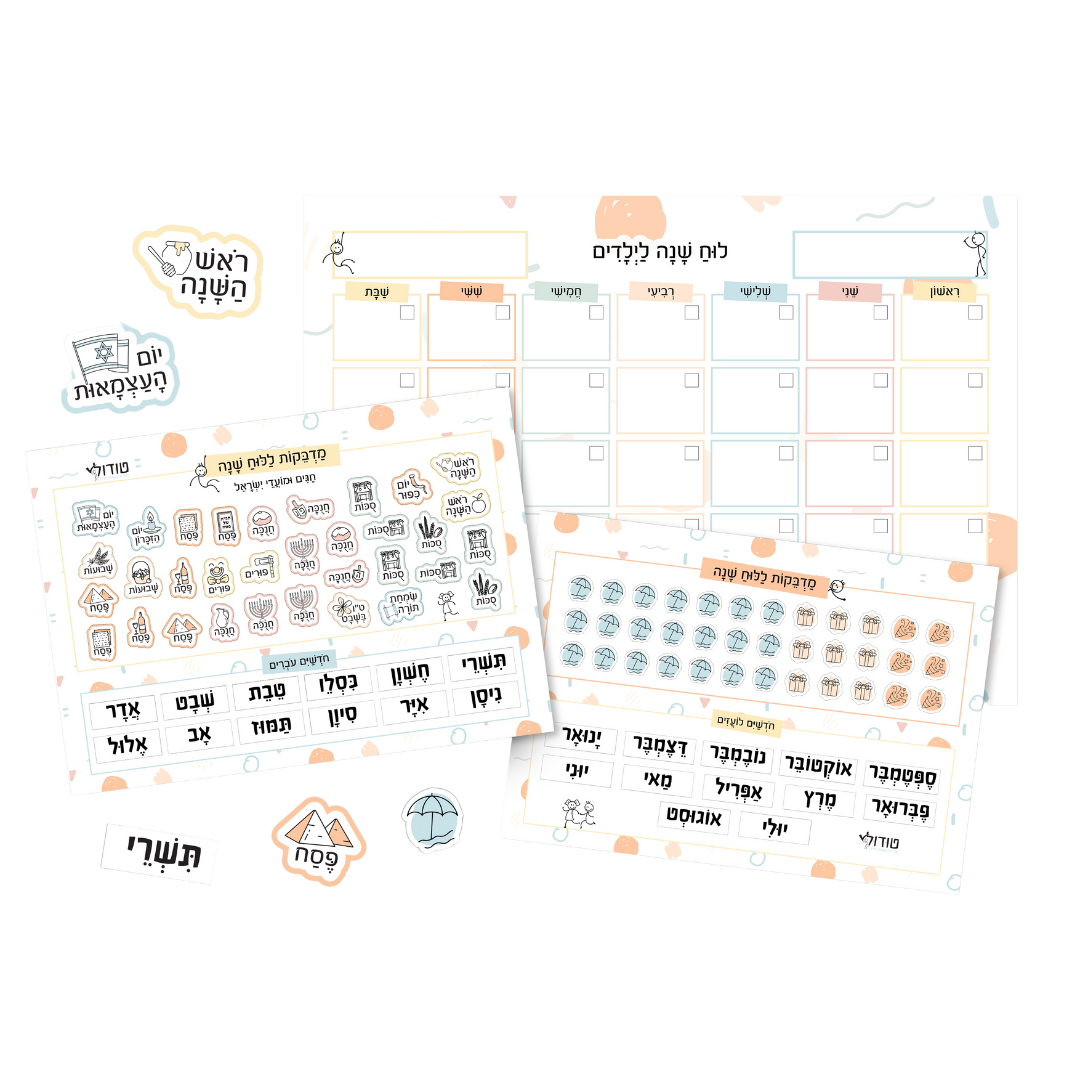 2 דפי מדבקות מעוצבים במיוחד: חגים, חופשים, אירועים, חודשים עבריים ולועזיים