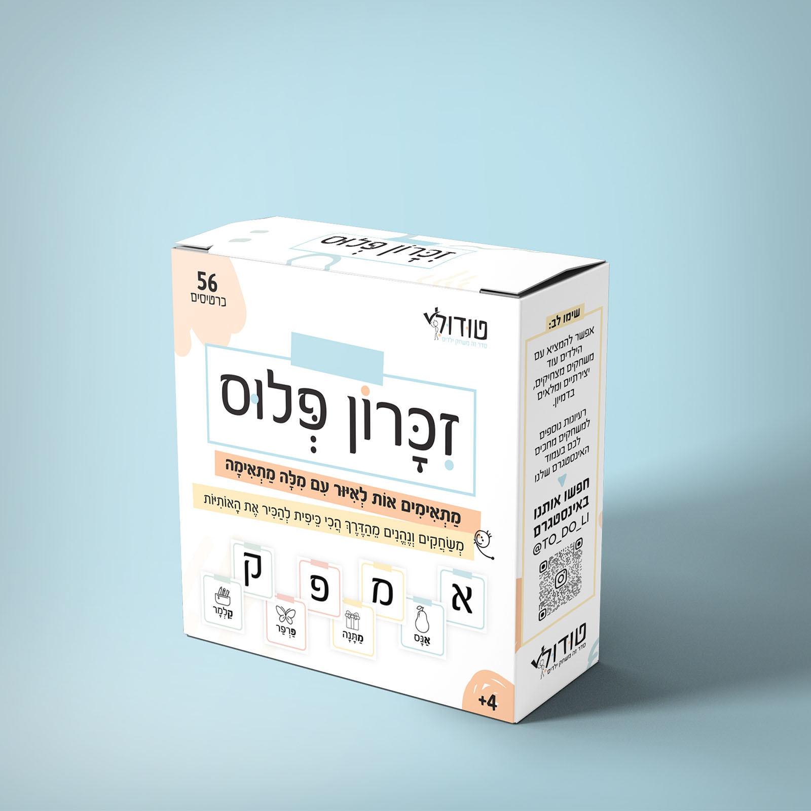 משחק זיכרון מיוחד שמשלב התאמות לוגיות בין כרטיסים. כולל גם רעיונות למשחקים נוספים לפיתוח חשיבה, שפה ודמיון. מתאים למשפחות, מורות להוראה מתקנת, אחים ואפילו גני ילדים. למידה חווייתית שמתרחשת תוך כדי הנאה ושיתוף.